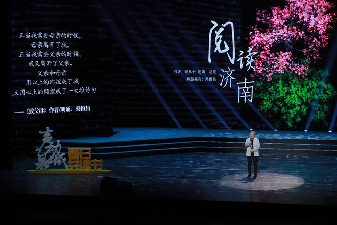 当晚的舞台迎来一位特殊的嘉宾。年逾八旬的著名诗人桑恒昌走上舞台,与观众分享了他数十年与书为伴的阅读感悟。他说,在济南,阅读不是少数人的雅事,而是每一个济南人都可以参与的生活日常。诵读不是少数人的专利,而是每一个济南人都可以抵达的光亮。