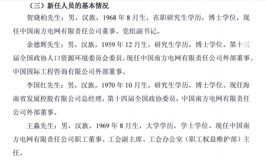 4月24日,中国南方电网有限责任公司(以下简称“南方电网”)发布公告,宣布公司董事会成员发生变动。根据公告信息,南方电网原董事刘启宏、外部董事曹培玺、周军平及职工董事梁传国卸任相关职务。经规范程序选聘,贺晓柏、余德辉、李国红、王淼新任公司董事。其中,贺晓柏任南方电网董事、党组副书记;余德辉、李国红任外部董事;王淼任职工董事。产经新闻热线电话:031-85196807