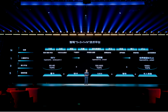 福田汽车打造了 "5+3+1+N" 智驾技术平台:"5" 涵盖重卡、轻卡、VAN、客车和无人装备 5 类智能线控底盘;"3" 提供 60-80TOPS、100-600TOPS、1000+TOPS 三个不同算力平台;"1" 是统一的智能化大模型平台,以端到端为基础,后续逐步拓展到VLA和世界模型;"N" 则代表干线、支线、城配、末端、城市微循环以及机场、矿山、园区等全场景智驾应用落地。