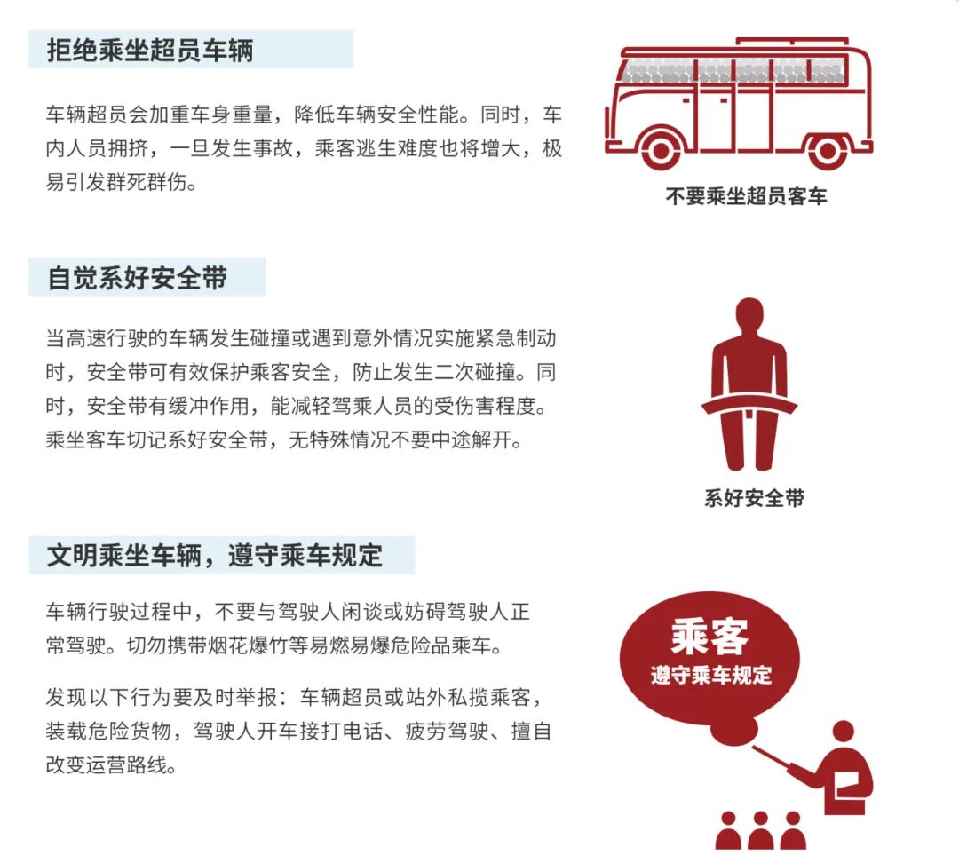 04 无座乘客最危险:超员乘客没有座椅、安全带等设施保护,一旦发生紧急情况,容易造成群死群伤事故,加重事故后果。