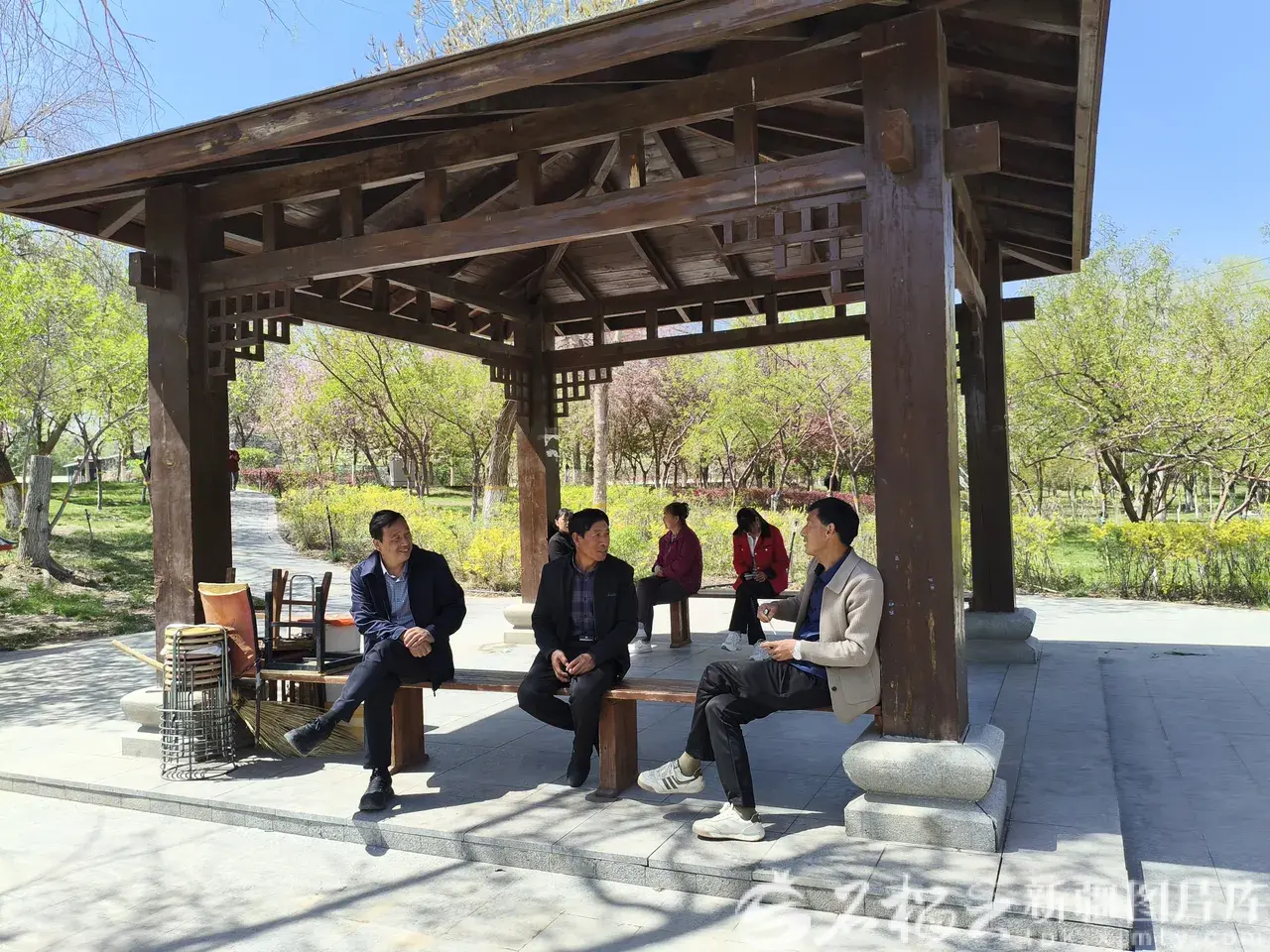 4月19日,市民在鲤鱼山公园一个凉亭下聊天。石榴云/新疆日报记者 胡大敏摄