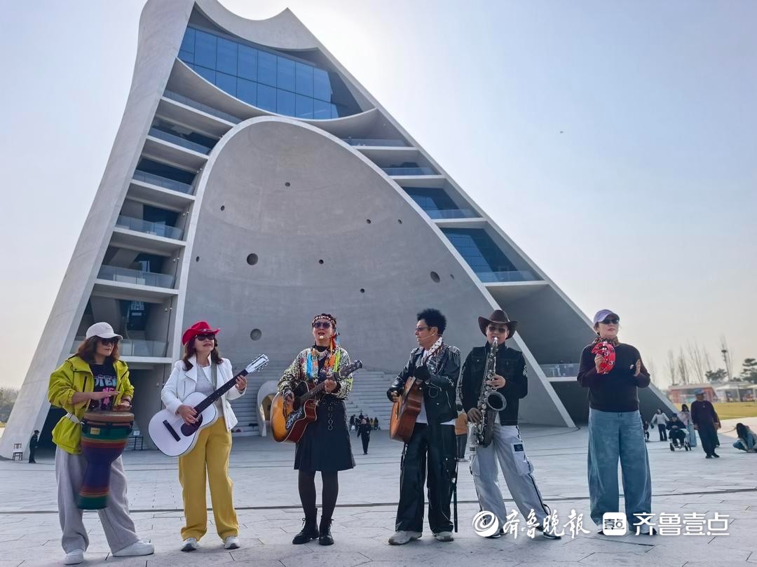 芳菲四月,海风穿过烟台时光塔广场,一阵吉他的扫弦声破空而来,“我独自走过你身旁……”《花房姑娘》的旋律随之漾开。几位身穿亮片皮衣、造型时髦的身影,正弹着吉他、吹着萨克斯,在广场上纵情放歌。