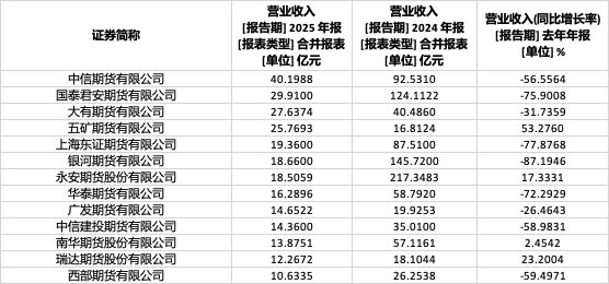 从营业收入规模来看,共有13家期货公司2025年营收突破10亿元大关。