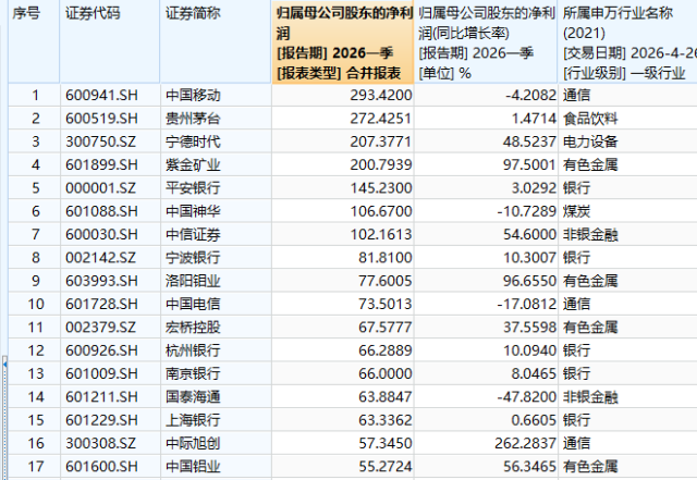 在已披露业绩的上市公司中,有17家今年一季度归属母公司股东的净利润超过50亿元,其中来自银行业5家、有色金属行业4家、通信行业3家、非银金融行业2家。
