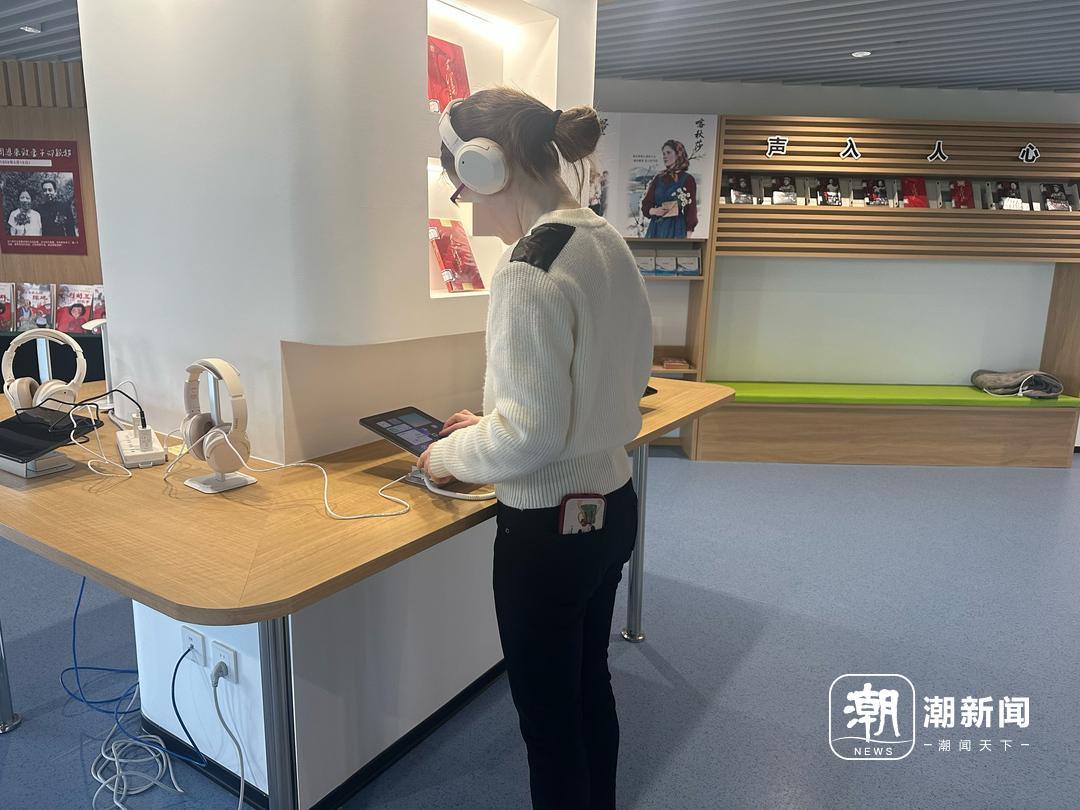 在中国盲文图书馆阅听互动体验区,记者看到一位视障读者正戴上耳机,使用盲用听书机专注地听书。馆内各阅览区配备视障阅览桌、盲文点显器、盲文电脑、助视器等相应的专业辅具,打造无障碍阅读体验。
