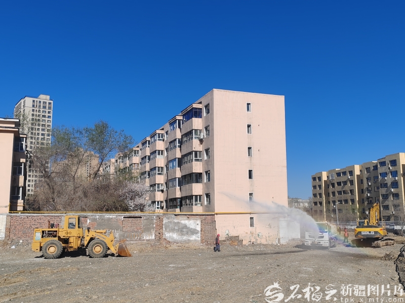 4月8日,乌鲁木齐市春光正好,米东区南苑社区文化体育设施场地配套建设现场一派繁忙景象,挖掘机、洒水车等有序作业。