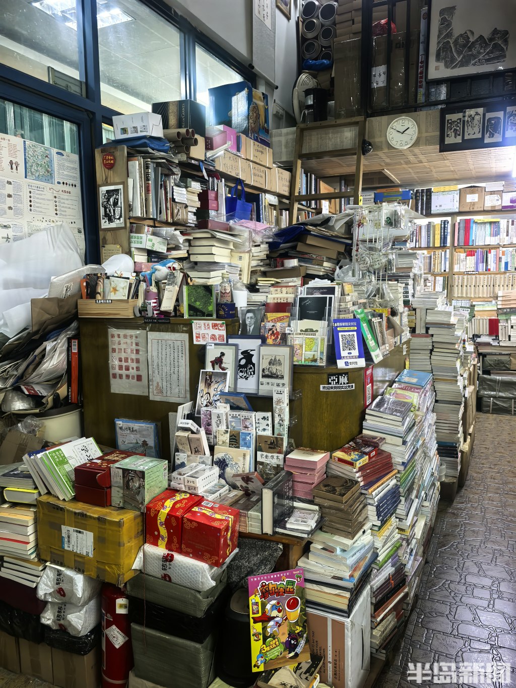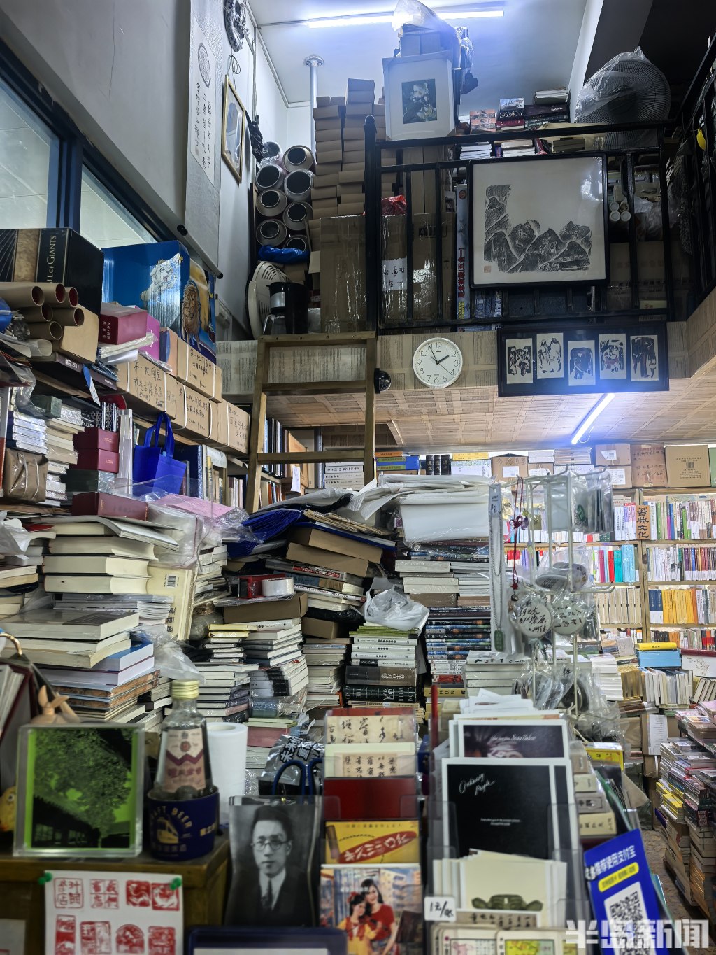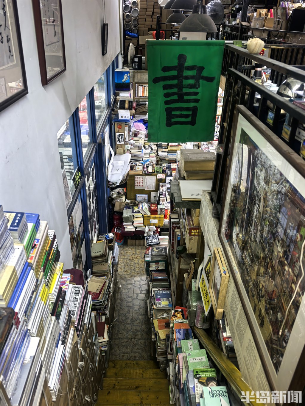 店内是复式结构。一楼三面墙壁,书架从地板直抵天花板,每一寸缝隙都被书填满。中厅的展台上,书也码得密不透风。二楼同样有一整面书墙,另辟出一块喝茶聊天的角落。连接一二楼的楼梯两侧,堆着足有一人高的书,用棕色皮纸捆扎着,原本就不宽的楼梯被挤得只容一人侧身而过。墙上还挂着店主的手书作品。