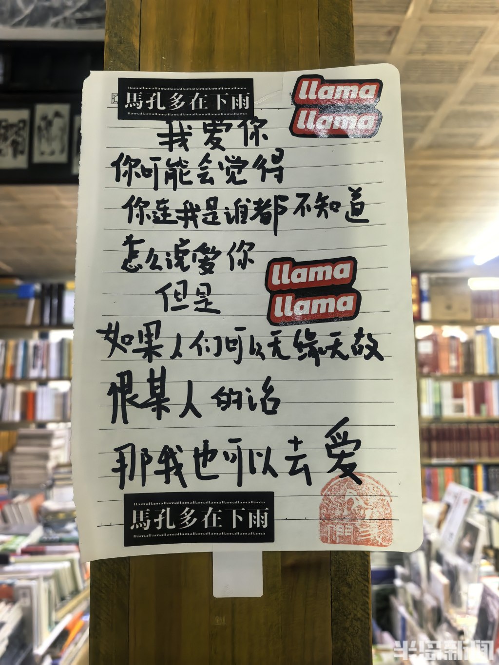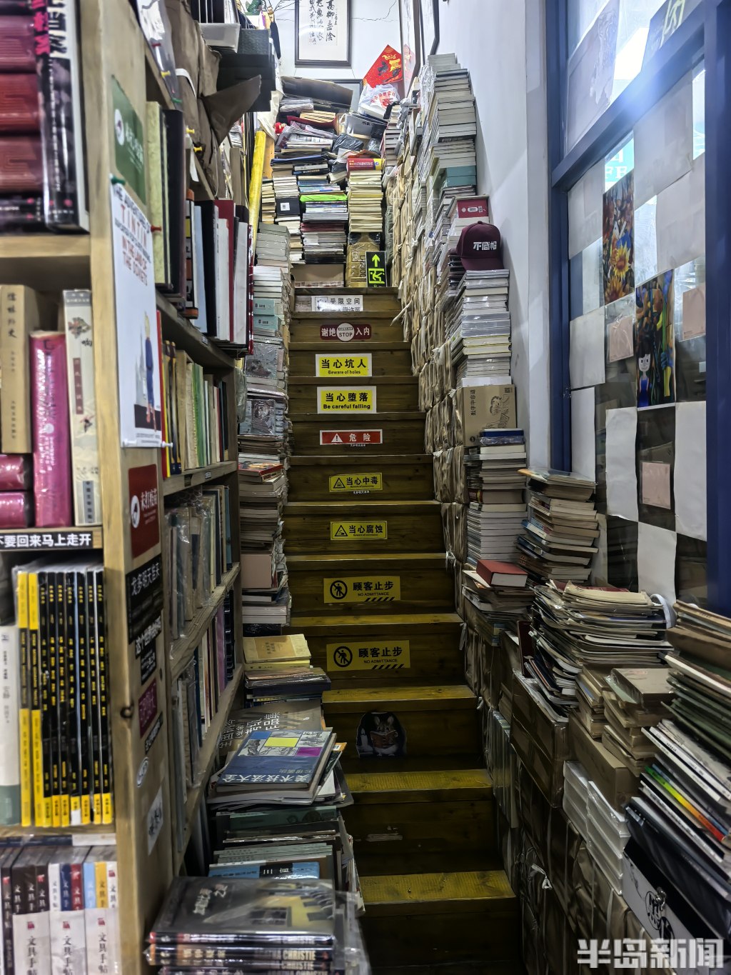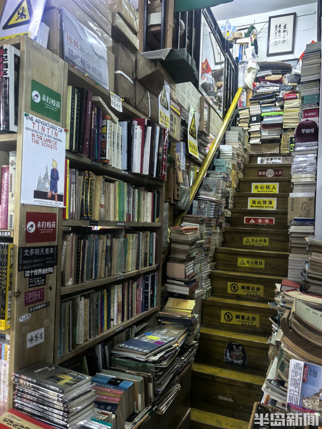 店内是复式结构。一楼三面墙壁,书架从地板直抵天花板,每一寸缝隙都被书填满。中厅的展台上,书也码得密不透风。二楼同样有一整面书墙,另辟出一块喝茶聊天的角落。连接一二楼的楼梯两侧,堆着足有一人高的书,用棕色皮纸捆扎着,原本就不宽的楼梯被挤得只容一人侧身而过。墙上还挂着店主的手书作品。
