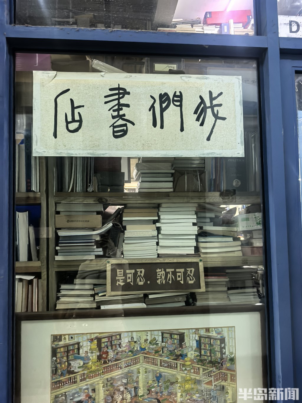 每一位初入“我们书店”的人,大约都会有同一个感受:这里的书,好满。满到还未走进店里,就先看见一摞摞书堆满了落地玻璃窗的内侧。白纸黑字、手写的“我们书店”四个大字,就那么朴素地贴在玻璃上,配以一扇蓝色门框,成了这家店最独特的标识。