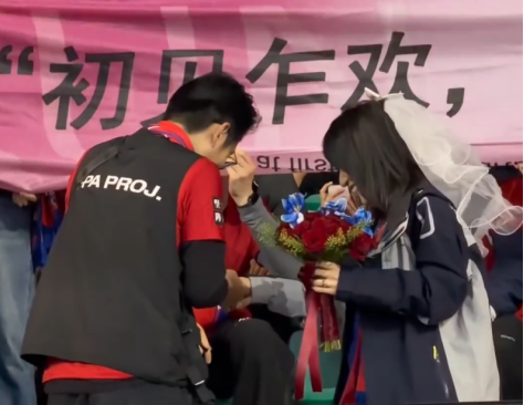 烟台赛区中场休息时,看台突然一阵骚动——一位年轻球迷单膝跪地,手捧鲜花,向相恋5年的女友求婚。