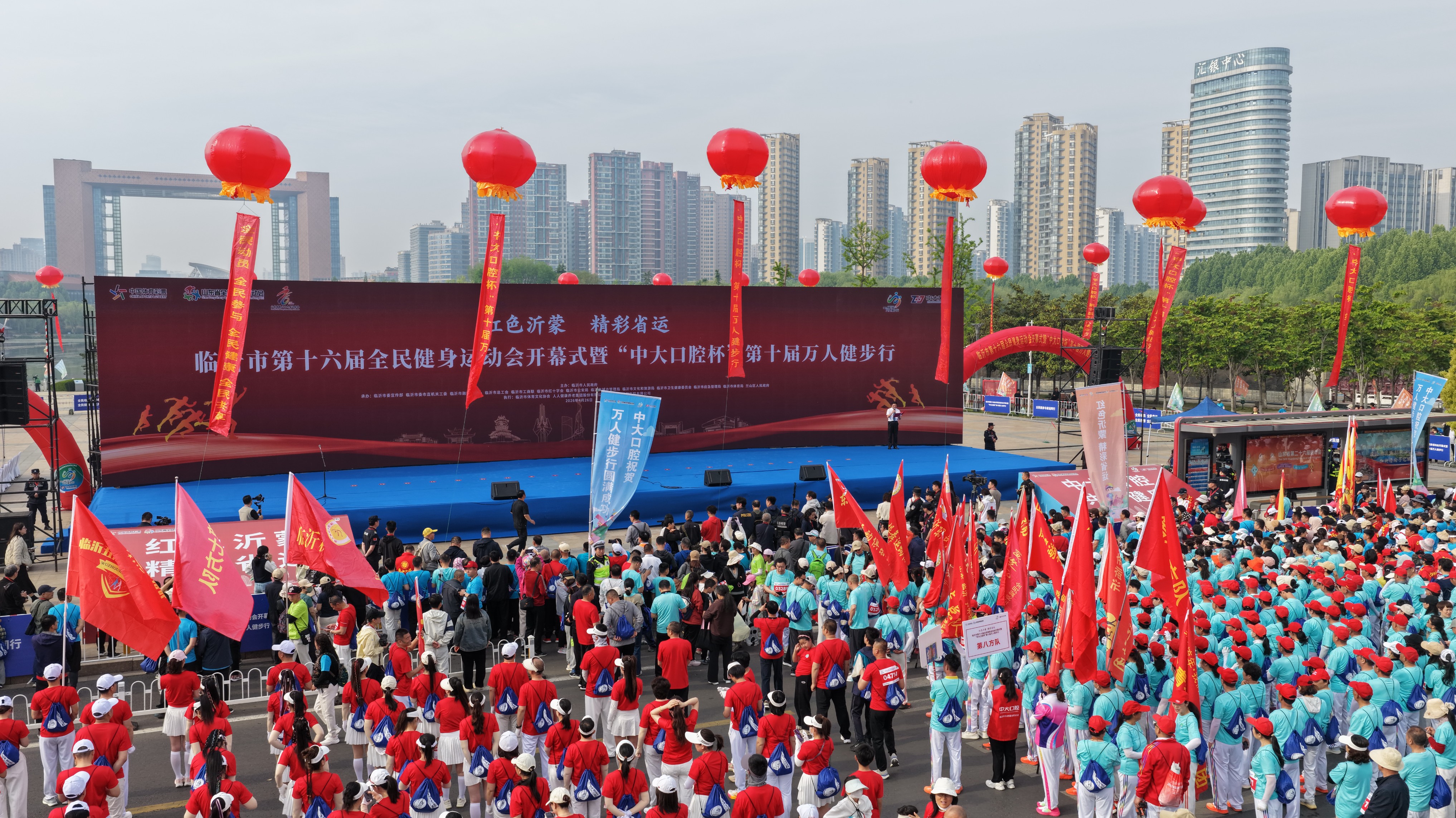 4月26日,临沂市第十六届全民健身运动会开幕式暨第十届万人健步行举行,来自社会各界、各行业系统12000名群众参与。