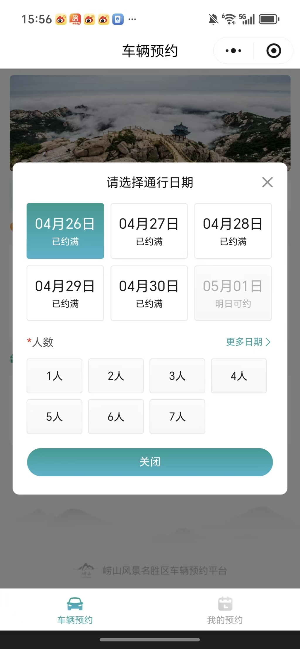 4月26日下午4时左右,记者登录“崂山风景区”微信公众号车辆预约通道,发现预约页面共显示6天的预约信息,其中4月26日至4月30日的都是“已约满”,5月1日的显示“明日可约”。从以前周末节假日的预约情况来看,4月27日早8时的预约会相当拼手速,极有可能秒没。首次预约者可提前登录系统完善车牌号码等信息,等到时间直接抢。如果5月1日的名额没抢上,此后几天可尝试预约“五一”小长假后面几天的名额。