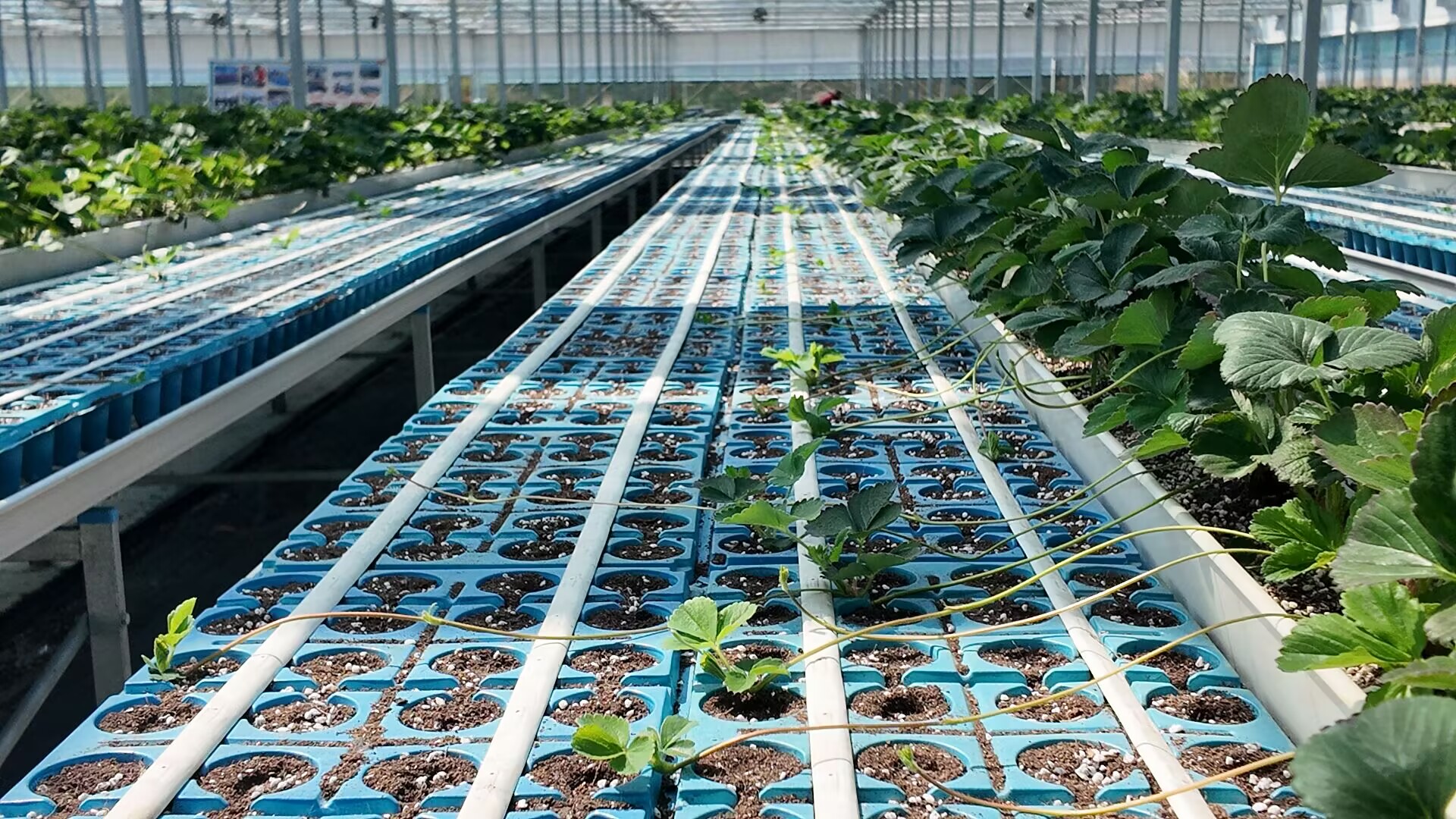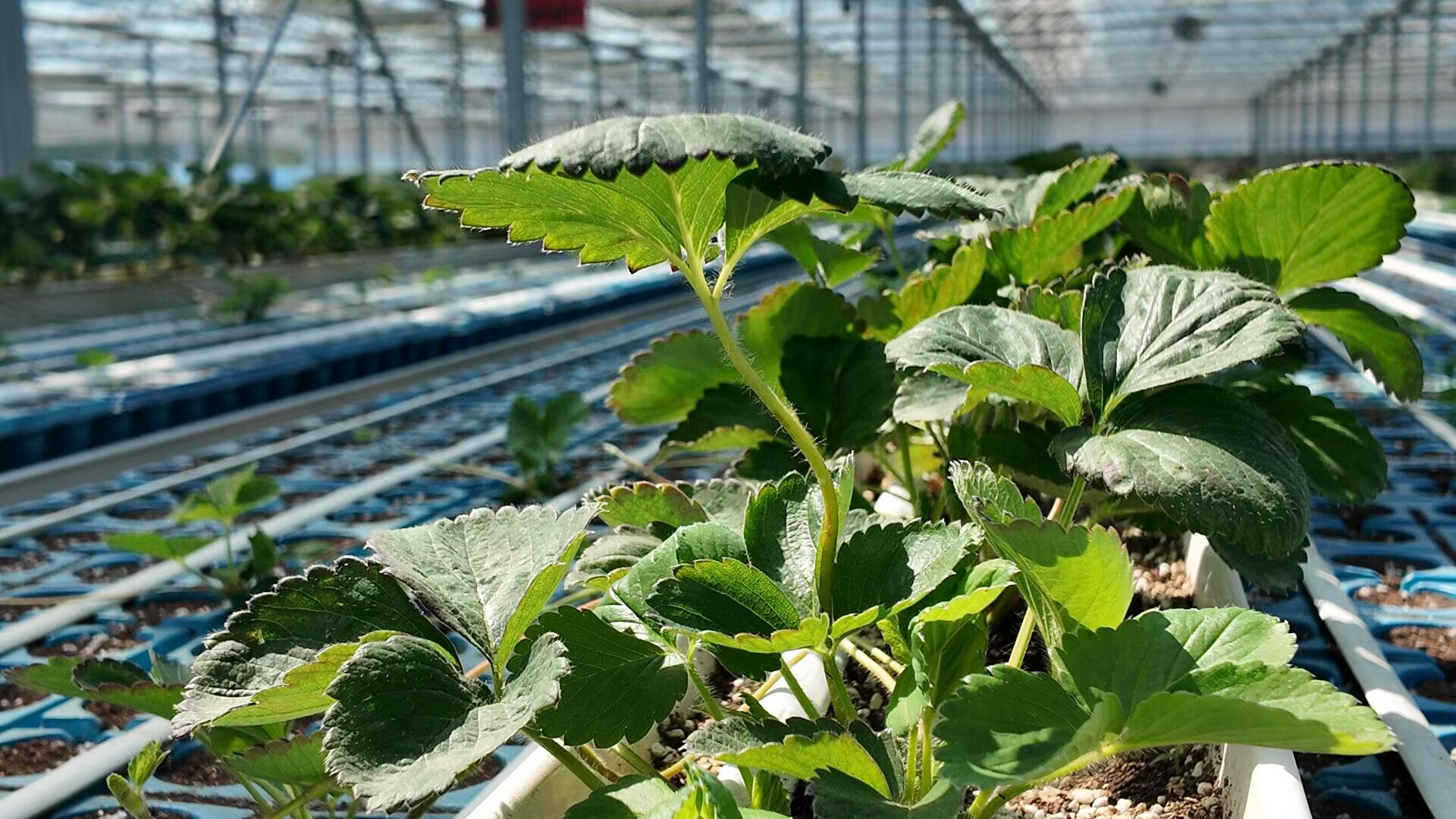 由于育苗过程中,草莓苗全程不与土壤接触,因此,从“莓好小镇”育苗棚里移栽的草莓苗,不会出现土传病害。