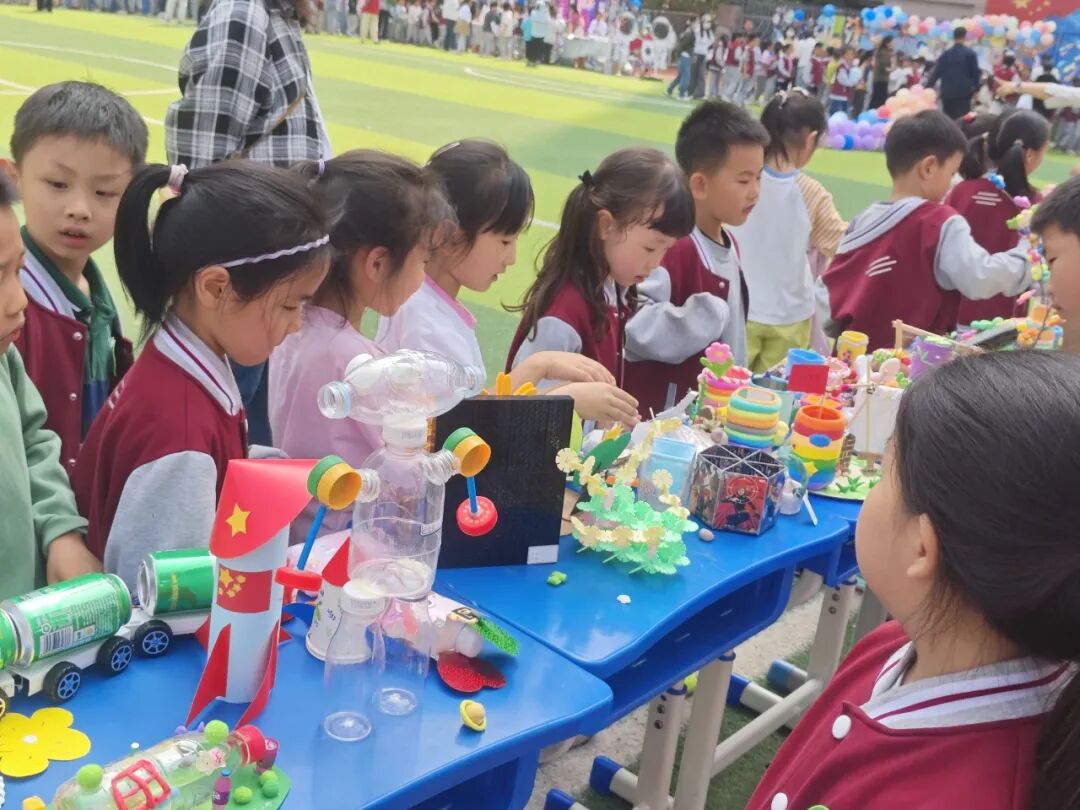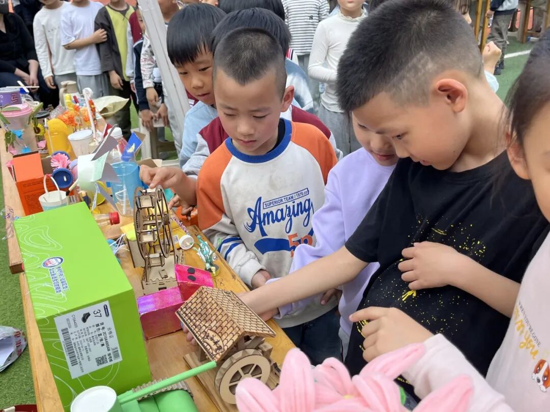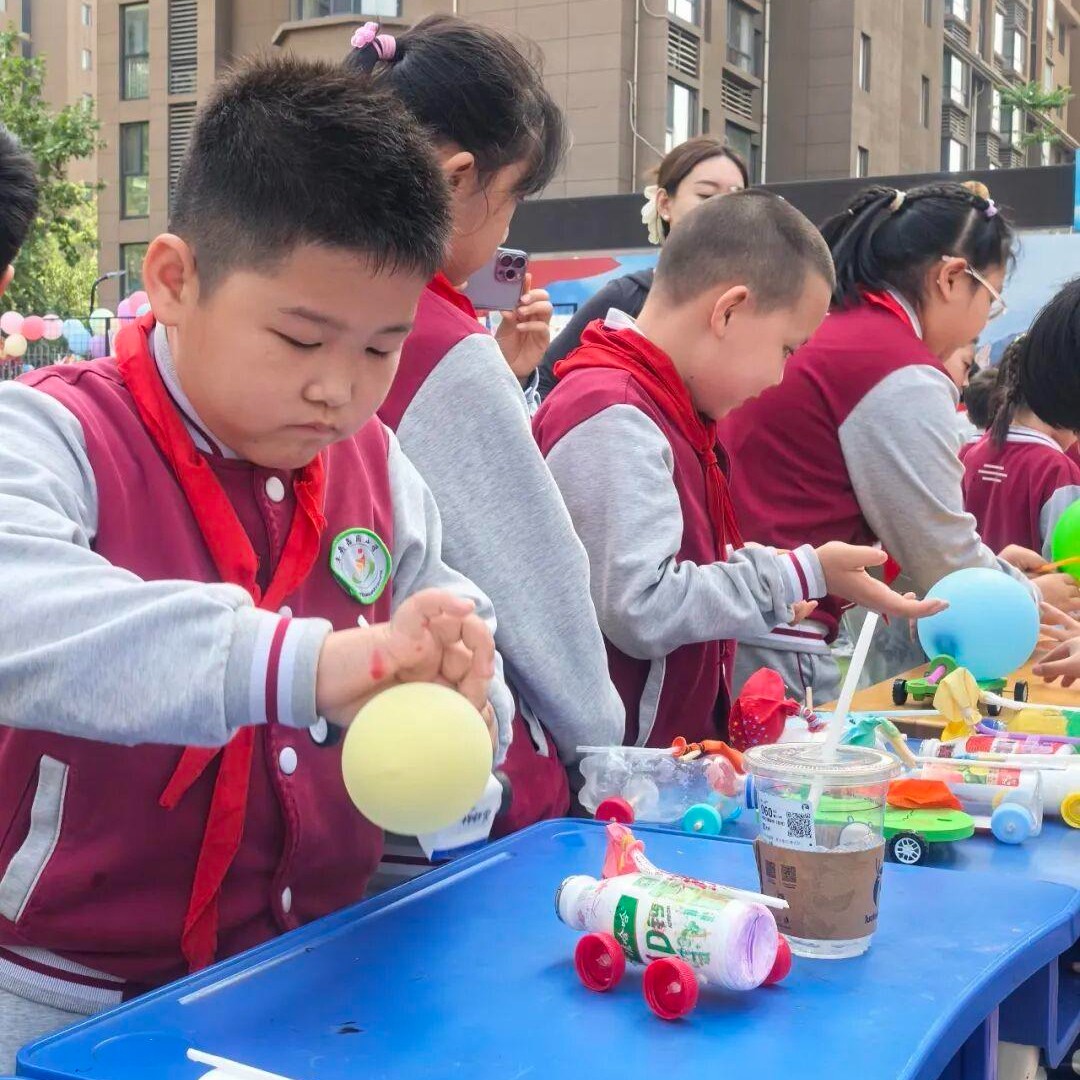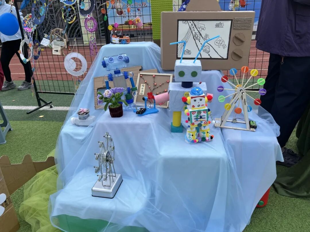 三年级以“变废为宝”为主题,利用生活中的废旧材料动手创作,一件件精巧别致的创意摆件琳琅满目,废旧纸盒、塑料瓶、旧瓶盖在同学们的巧手下焕然一新,变身成趣味笔筒、可爱摆件、迷你建筑等创意作品。现场还有趣味十足的悬浮气球实验,生动展现科学奥秘,让大家直观感受空气浮力的神奇魅力。