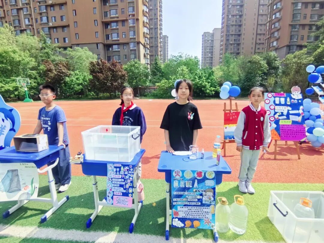 五年级以“探秘海洋”为主题。同学们围绕海洋主题精心设计了六大趣味科学实验,乒乓球悬浮术、3D幻影生动展现物理奥秘,火山爆发模拟、净水系统实验直观呈现海洋环境与水资源保护知识,生态系统模拟、动力轮船实验则让海洋生态与航海原理跃然眼前。