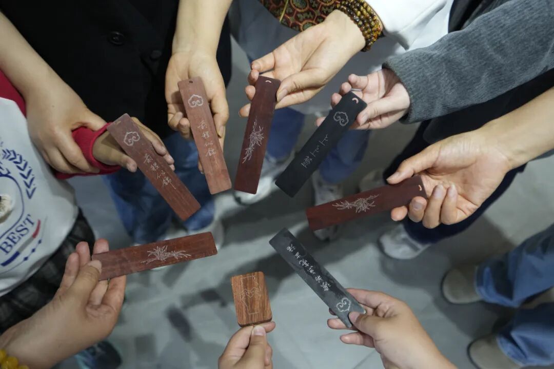 手作完成后,大家纷纷展示自己的红木嵌银书签作品,交流创作心得。有人分享自己刻槽时的小小心得,有人惊叹银丝嵌进红木纹理的精致效果,不少人拿着自己亲手制作的成品合影留念。活动最后,现场还围绕非遗保护、技艺传承与文化创新开展了轻松的互动交流,大家在分享中传递工匠精神,也为这场手作体验画上了圆满的句点。