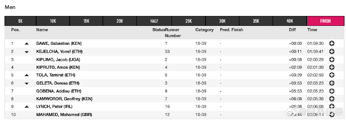 获得亚军的科杰尔查同样打开两小时,1小时59分41秒创造人类首马历史最好成绩;雅各布·基普里莫获得季军,2小时00分28秒同样超越了基普图姆保持的原世界纪录!