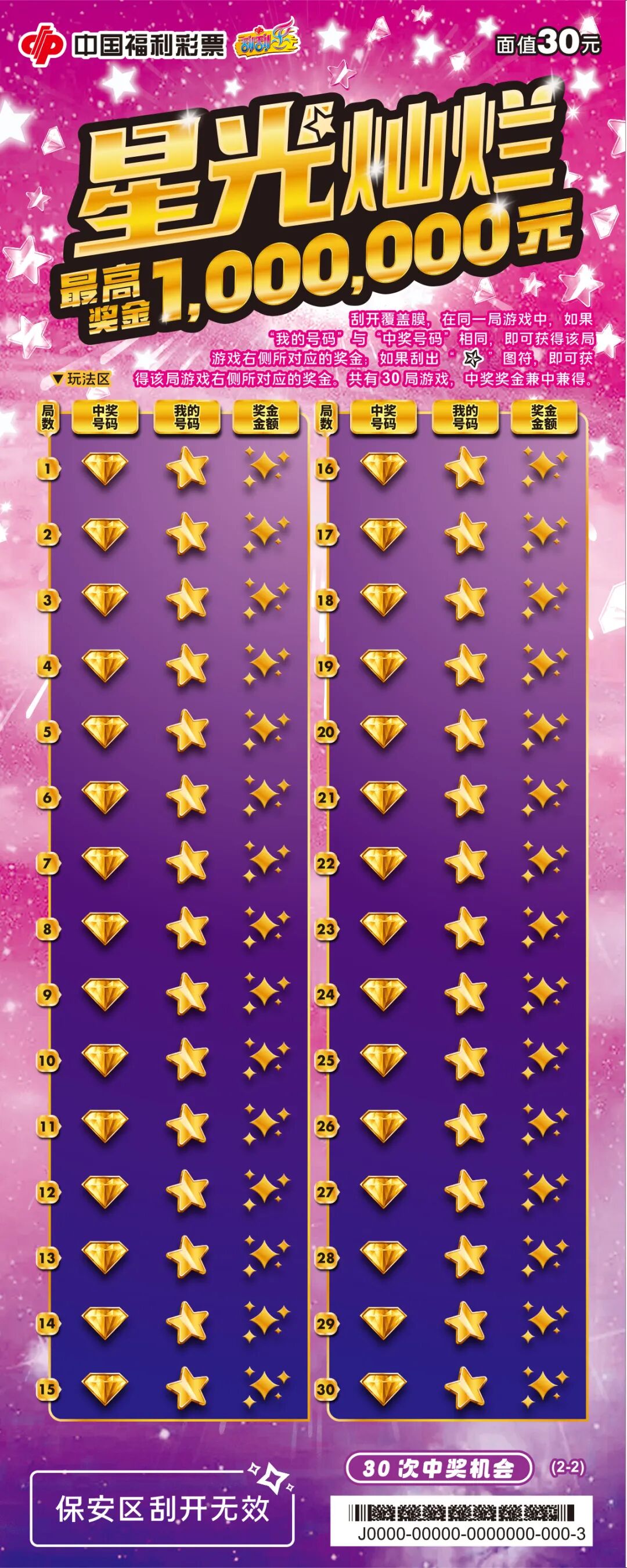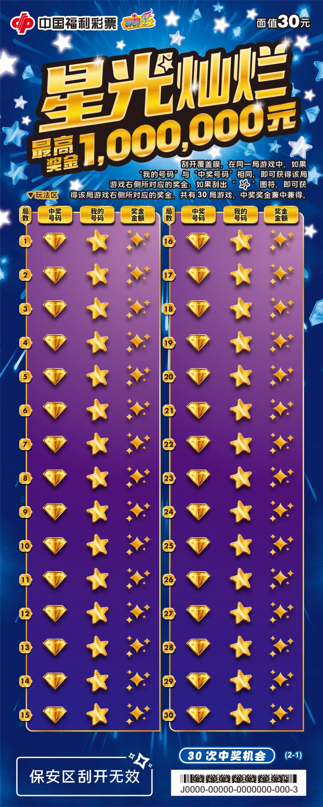 “星光灿烂”面值30元,玩法简洁易懂。刮开覆盖膜,在同一局游戏中,如果“我的号码”与“中奖号码”相同,即可获得该局游戏右侧所对应的奖金;如果刮出“