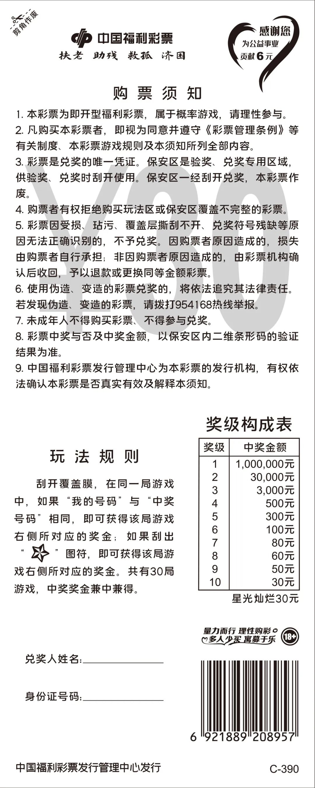 每一张“星光灿烂”刮刮乐,都承载着公益的使命,蕴含着购彩者的善意。每一张“星光灿烂”彩票,都能为公益事业贡献6元彩票公益金,用于扶老、助残、救孤、济困等民生事业。