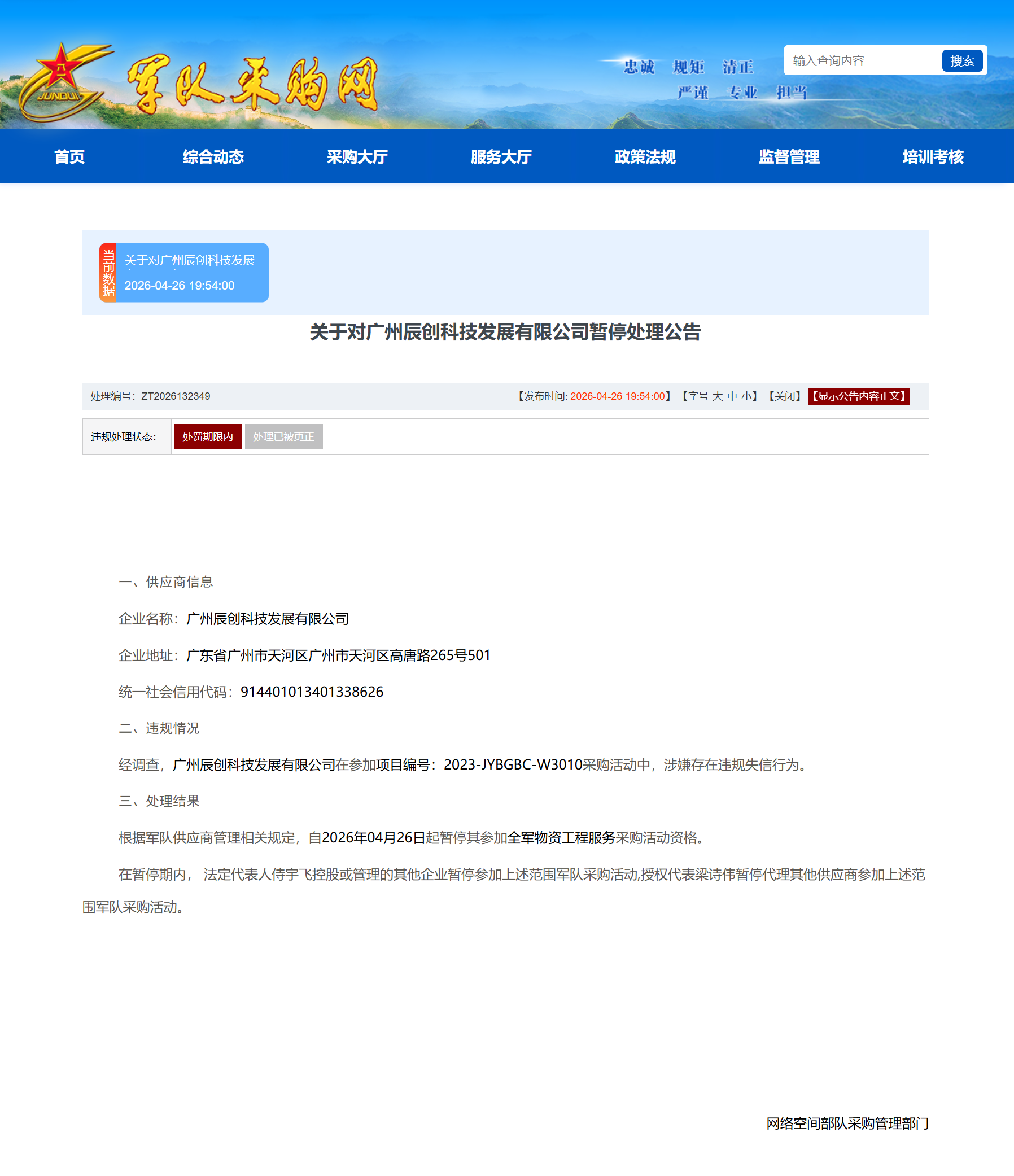 4月26日,军队采购网发布一则供应商违规处理公告,显示广州辰创科技发展有限公司因存在“围标串标”行为,被暂停参加全军物资工程服务采购活动的资格。该公告由网络空间部队采购管理部门发出,自2026年4月26日起生效。