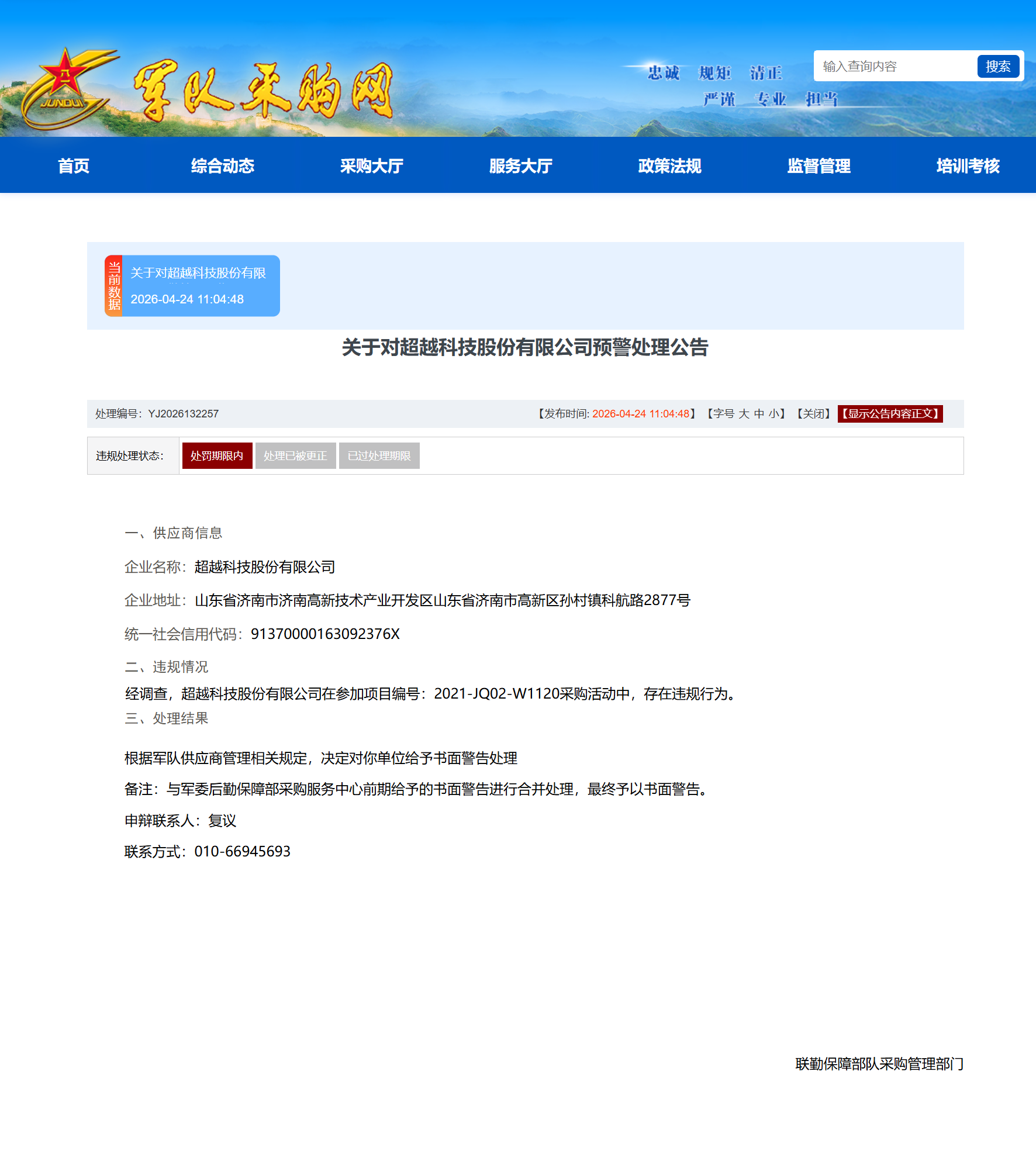 军队采购网发布预警处理公告 超越科技股份有限公司因违规被书面警告