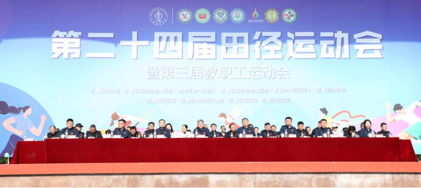 4月25日至26日,齐鲁医药学院第二十四届田径运动会暨第三届教职工运动会举行。开幕式上,学校党委常务副书记、董事长魏振东,党委书记张业赏,党委副书记、校长韩冰,附属医院(淄博市第一医院)党委副书记、院长郑建彬,学校党委委员、副校长耿磊、杨路、杜青青,附属医院(淄博市第一医院)党委委员、纪委书记李涛,校长助理以及各部门、各单位、各学院负责人在主席台就座。