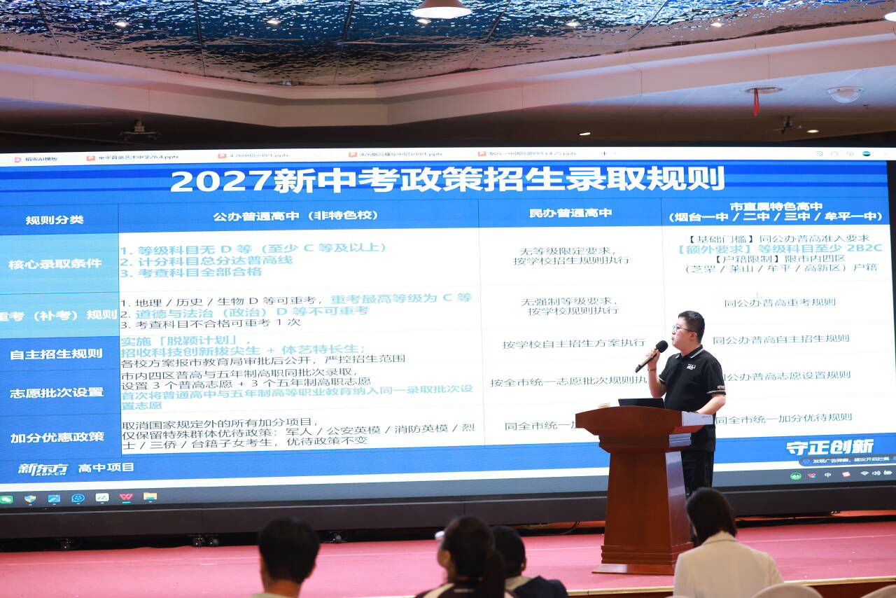 上午9点,宣讲区特色宣讲开始,新东方升学规划专家率先登台,用15分钟梳理了中考政策要点、志愿填报“冲稳保”策略,台下家长纷纷举起手机拍照记录。