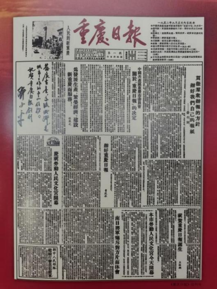 1952年8月5日,《重庆日报》正式创刊发行。在《重庆日报》的创刊号上,邓小平题写了“发展生产,交流城乡,是城市工作的中心任务”的题词。