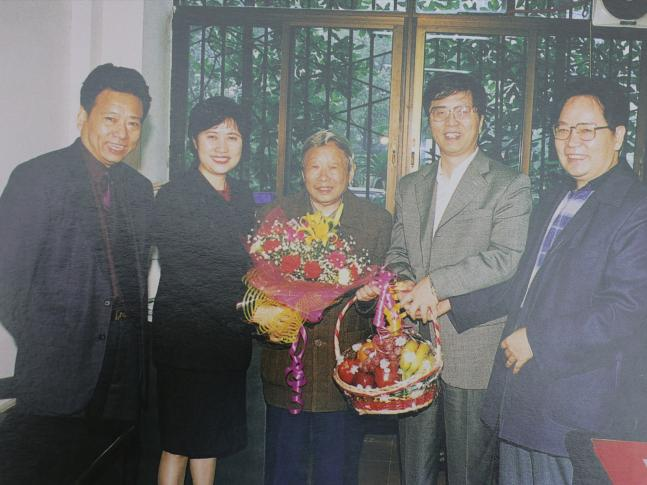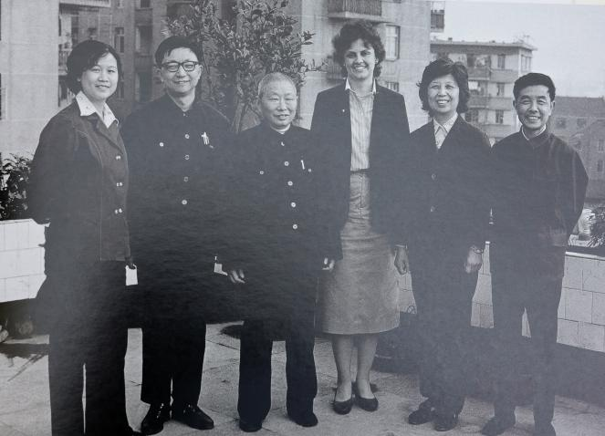 1983年4月9日,王镛(左二)、雷勃(左三)与美国《华尔街日报》驻伦敦记者克郎霍尔兹合影