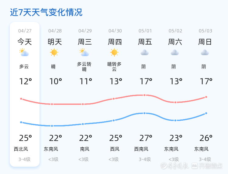 今天是4月27日,星期一,农历三月十一。临沂市今日天气多云,气温适中,最高气温25℃,最低气温12℃,当前温度17.9℃,西南风1级,空气湿度70%,PM2.5指数86,空气质量良好。全市各区天气情况一致,均为多云,市民出行请注意防晒和保暖。nn明日临沂市天气将转为晴朗,气温有所下降,最高气温22℃,最低气温10℃,相比今日气温略有降低。风力较今日有所减弱,东南风风力小于3级,市民出行需注意早晚温差,适时增减衣物。nn未来三天,临沂市天气以多云和晴天为主,气温在10℃至25℃之间波动。周三多云转晴,气温11℃至22℃;周四晴转多云,气温13℃至25℃;周五天气转阴,气温17℃至27℃,风力有所增强,西南风3-4级。市民需注意天气变化,合理安排出行计划,特别是周五的阴天和大风天气可能对户外活动产生影响,建议减少不必要的外出。nn温馨提示
