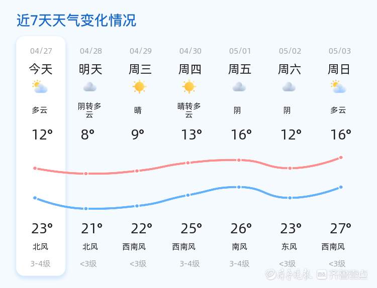 预计明日(4月28日)天气将转为阴天,气温有所下降,最低气温降至8℃,最高气温21℃。与今日相比,明日不仅气温降低,天气状况也有所变化,市民出行需注意保暖,及时增添衣物。