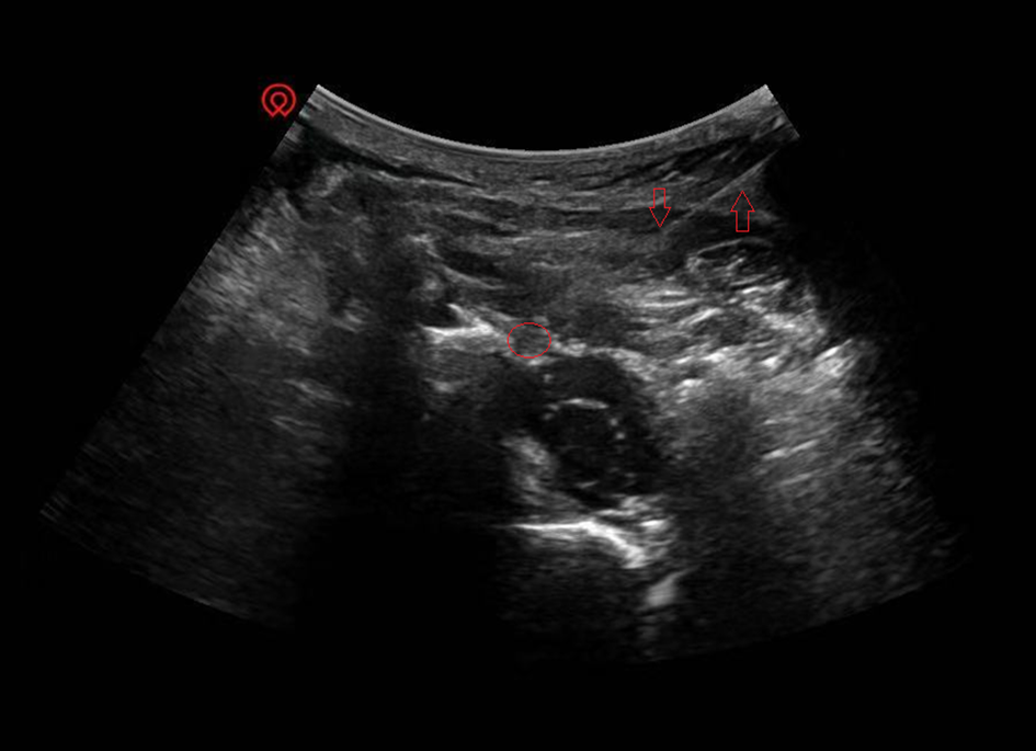 圆圈为颈2背根神经节,箭头为穿刺射频针