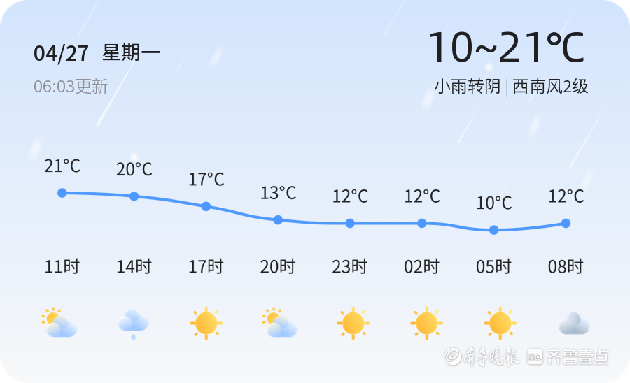 今日是4月27日,星期一,农历三月十一。烟台市今日天气为小雨转阴,气温介于10℃至21℃之间,西南风2级,空气湿度为72%。空气质量状况为良好(PM2.5指数94),市民可以正常户外活动。由于今日有小雨天气,建议市民出行时携带雨具,注意防滑,驾车时减速慢行,确保行车安全。