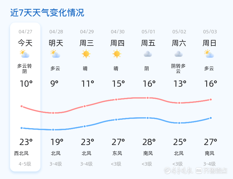 明天4月28日,潍坊市天气转为多云,气温较今日有所下降,预计在9℃至19℃之间,北风3-4级。与今天相比,明天的最高气温下降了4℃,最低气温下降了1℃,风力变化不大,市民需注意及时调整衣物,防范气温变化带来的不适。