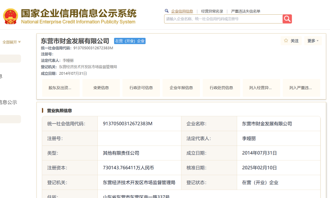 国家企业信用信息公示系统显示,近日,东营市财金发展有限公司(下称“东营财金发展”)股东及主要人员发生变动。