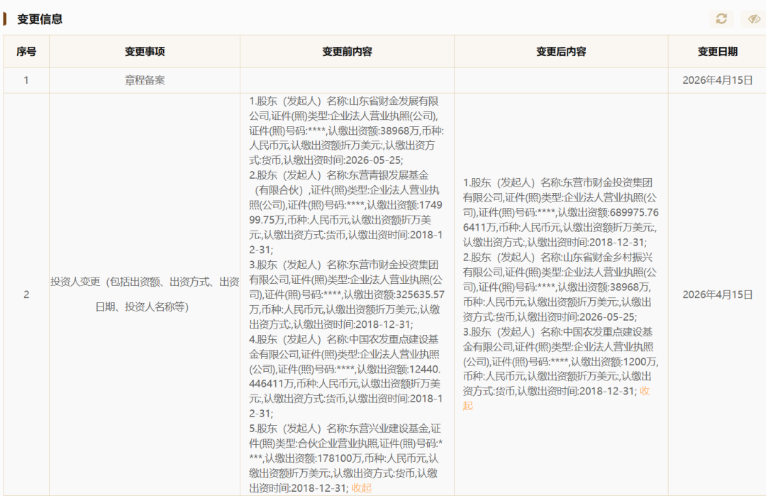 股权变动方面,原股东东营兴业建设基金(有限合伙)、东营青银发展基金(有限合伙)退出,二者此前分别持股24.3925%、23.9678%;中国农发重点建设基金有限公司持股比例由1.7038%降至0.1644%。上述股权均由大股东东营市财金投资集团有限公司受让,其持股比例由44.5988%提升至94.4986%。山东省财金乡村振兴有限公司持股5.3370%,保持不变。