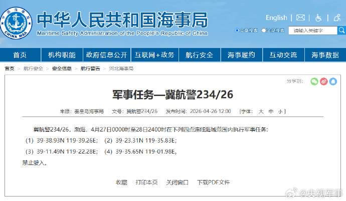 航行警告!渤海部分海域执行军事任务央视军事 2026-04-27 07:08:06据中国海事局网站消息,秦皇岛海事局发布航行警告,4月27日0时至28日24时,渤海部分海域执行军事任务,禁止驶入。 责任编辑:许光宇