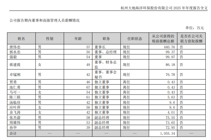 值得注意的是,公司董事长唐伟忠2025年从公司获得的税前报酬总额为440.76万元,而2024年其薪酬为120.68万元,薪酬上涨320.08万元。除董事长外,其余董事、高级管理人员薪酬均随公司业绩亏损相应下调。