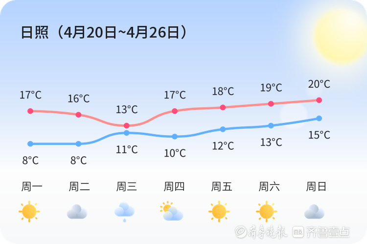 全市周平均最高温17℃,平均最低温11℃,平均气温14℃,周最高气温20℃,出现在周日,周最低温8℃,出现在周一、周二。