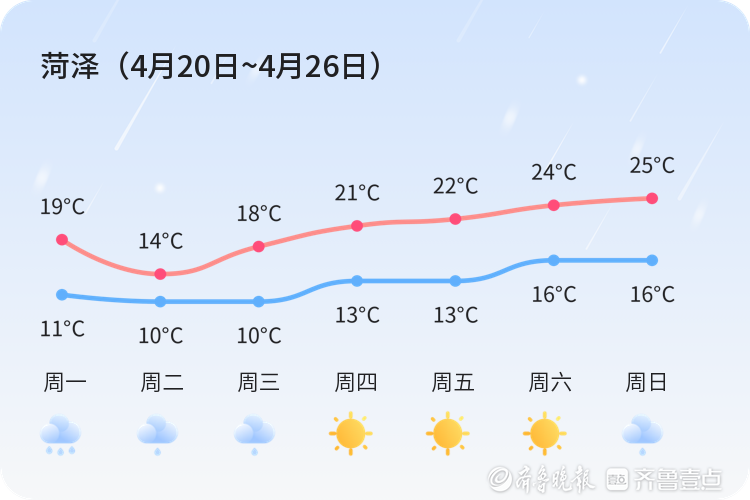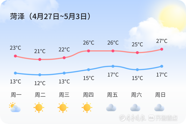 全市周平均最高温24℃,平均最低温14℃,平均气温19℃,周最高气温27℃,出现在周日,周最低温12℃,出现在周二。