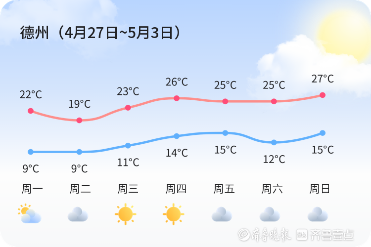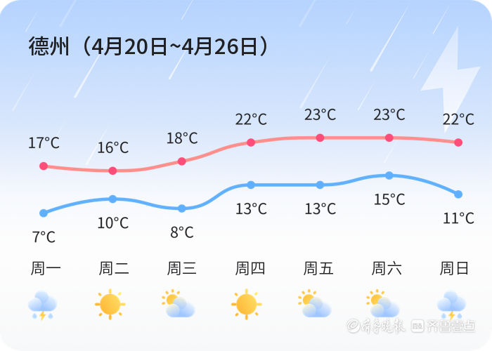 全市周平均最高温20℃,平均最低温11℃,平均气温15℃,周最高气温23℃,出现在周五、周六,周最低温7℃,出现在周一。