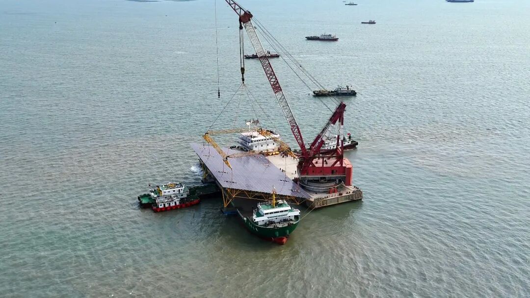 ▲图为位于田横湾的中电建青岛即墨海上光伏项目吊装现场。杨文昌/摄