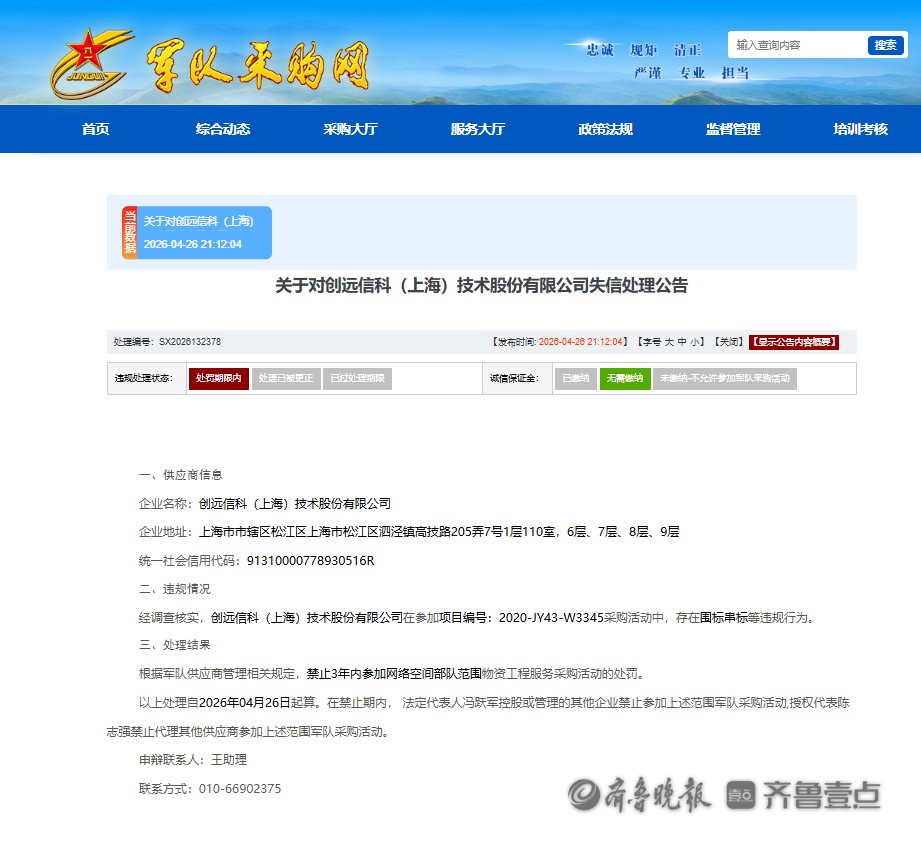 4月26日,军队采购网发布关于对创远信科(上海)技术股份有限公司(创远信科 920961.BJ)失信处理公告。