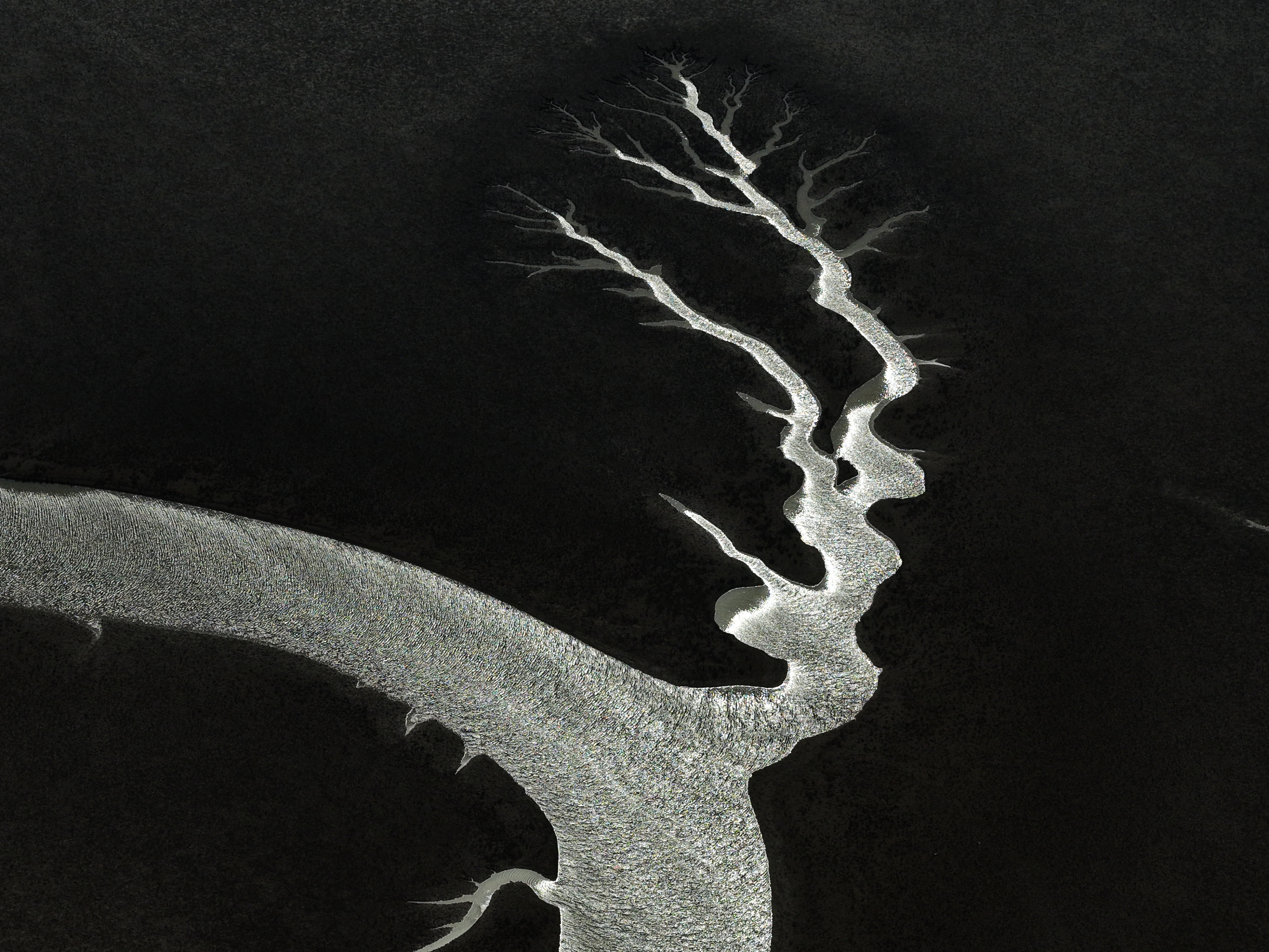 用光方面,作品采用极简高对比黑白影调,以纯黑大地为底、银白水脉为形,光影反差极致,强化视觉张力。构图方面,作品采用垂直延伸的树状水系主体,与横向主河道形成动静交错的视觉结构,主次分明,有线条韵律感。影像构成方面,水系脉络如枯树虬枝,抽象意象极具艺术感染力,将自然地貌升华为生命符号。作品有一点小缺憾:画面元素单一,层次稍弱,若保留少许环境肌理,对比质感会更丰富。