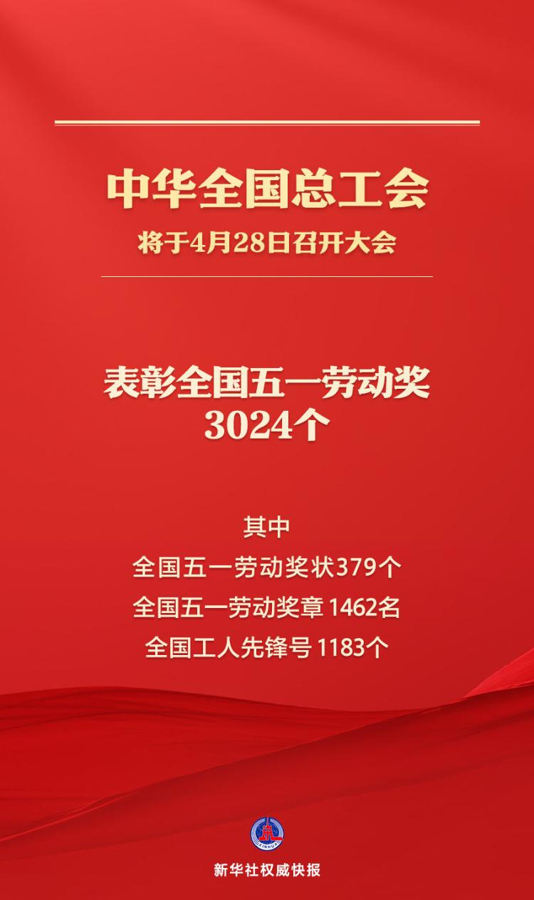 “五一”国际劳动节即将到来。记者4月27日从中华全国总工会获悉,全国总工会将于4月28日召开庆祝“五一”国际劳动节暨全国五一劳动奖表彰大会,届时将表彰全国五一劳动奖3024个,其中全国五一劳动奖状379个、全国五一劳动奖章1462名、全国工人先锋号1183个。