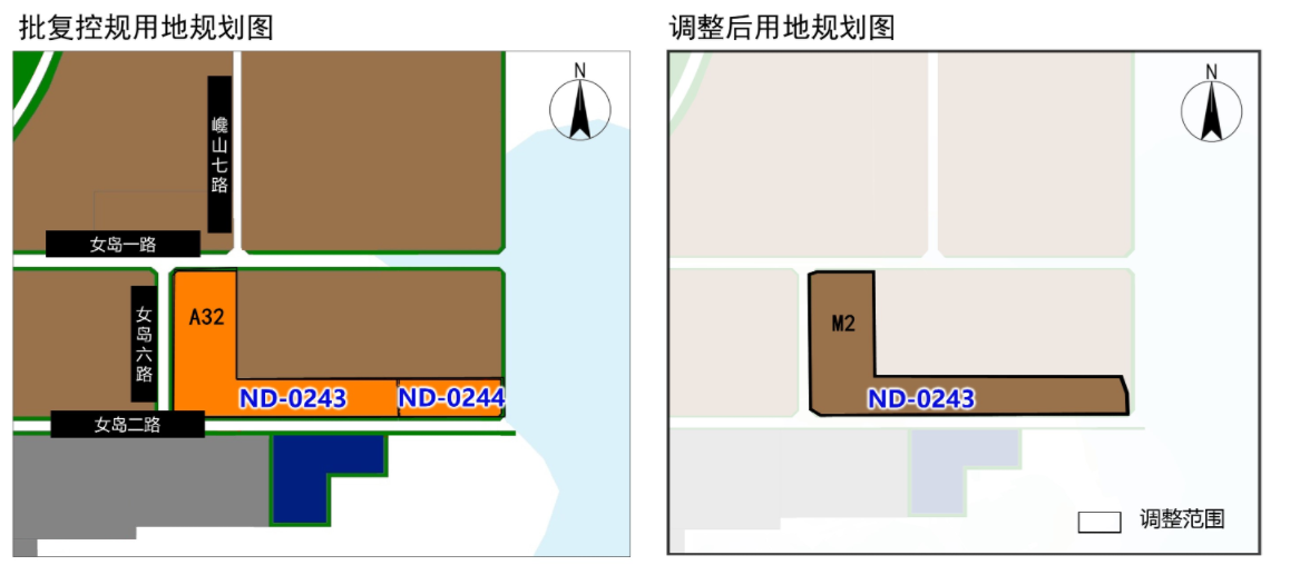 本次调整对区域内道路及绿化带进行优化:女岛六路向西平移5米,女岛二路向南平移5米;原女岛一路道路红线由30米调整为25米,道路两侧绿化带宽度由10米调整为5米,进一步集约利用土地资源;原ND-0243、ND-0244两个地块将合并为单一地块,用地性质由原A32(科研教育用地)变更为M2(二类工业用地),地块总用地面积12.09公顷。