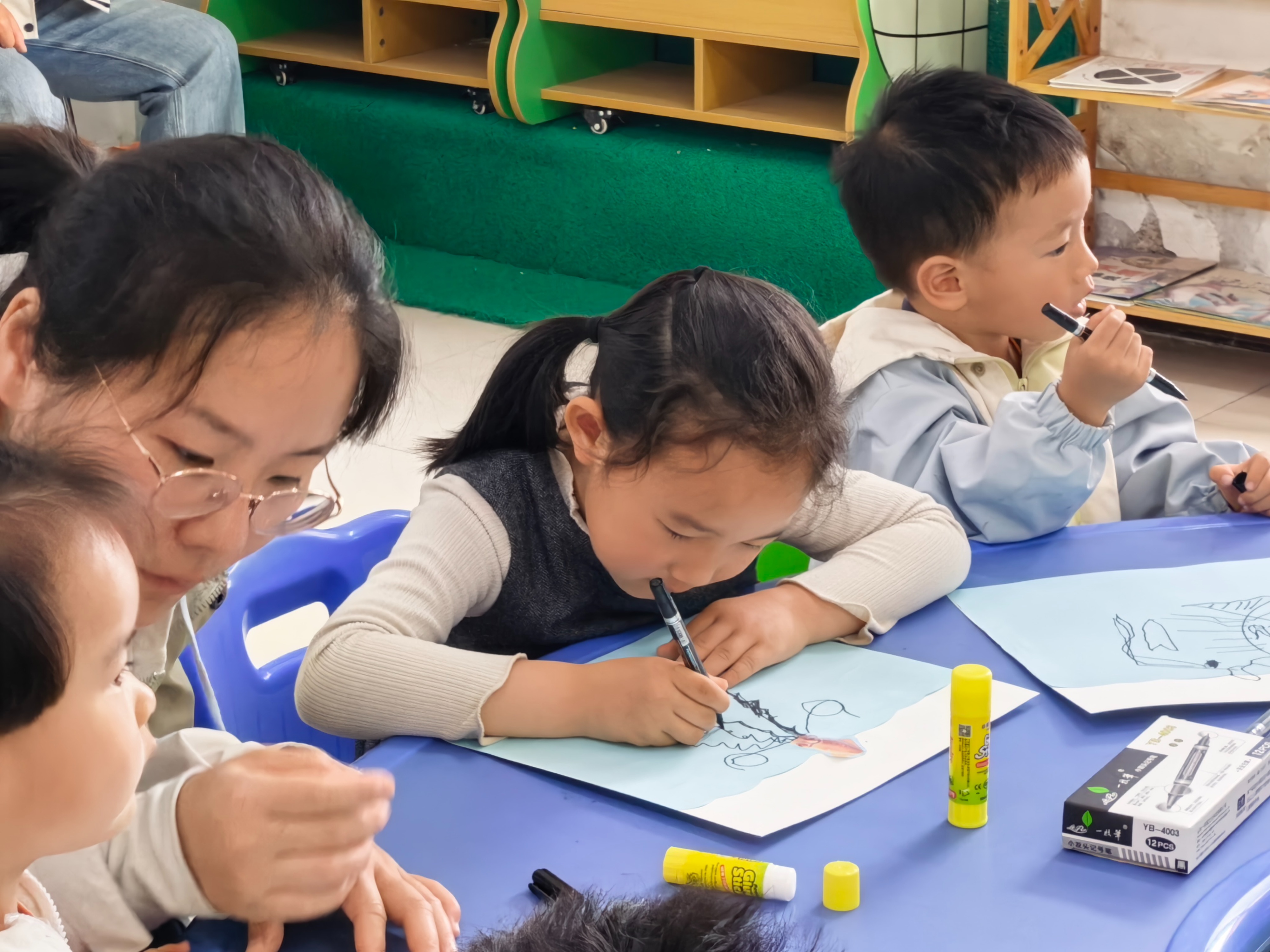 绘本故事分享结束后,创意手工绘画环节正式开启。为让小朋友们沉浸式打造海洋场景,赵永丽提前精心准备了手工绘画材料,在白色水彩纸上粘贴好波浪形蓝色彩纸,模拟出灵动辽阔的海面效果,为孩子们搭建好了充满氛围感的创作基底。创作过程中,小朋友们充分放飞想象力,随心创作。大家笔尖灵动,在蔚蓝的“海面”之下,勾勒出形态各异、色彩斑斓的海洋生物,有自由自在的小鱼、俏皮可爱的螃蟹、飘逸灵动的水母,还有海龟与各类新奇的海洋小精灵。每个孩子都全身心投入创作,一笔一画皆是童真创意,一幅幅独一无二的海洋主题画作渐渐成型,尽显孩子们天马行空的想象力。