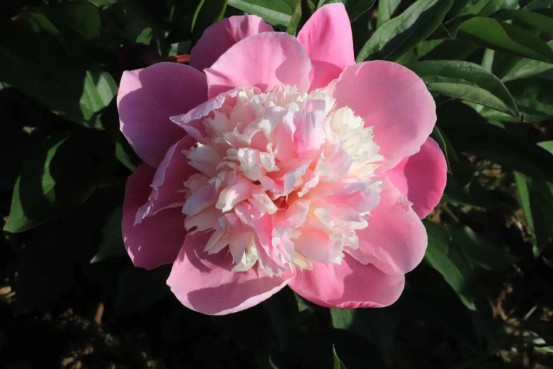 草莓奶昔(2024年选育):托桂型,外轮瓣大而平展,暖粉色,边缘略浅;内轮瓣极多、细密簇拥,粉色高耸呈“山包”状。内外瓣间有一圈白色细瓣,如“裙撑”般优雅。花直径18厘米,花高8厘米,当年生枝可达1至1.1米。