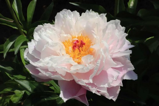 红顶鹤(2022年选育):菊花型,花型规整,雌蕊部分瓣化形成红色飞瓣,花色浅粉,边缘变白,雄蕊无瓣化,偶有白色碎瓣点缀其间。花直径16厘米,当年生枝可达1.2至1.3米。