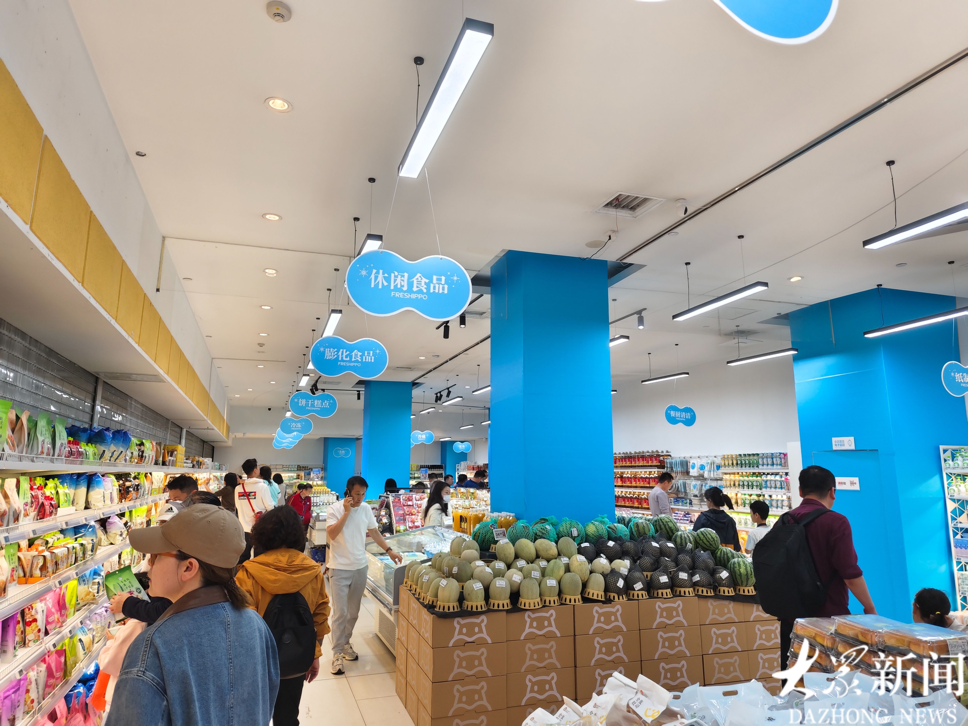 近日,盒马鲜生快闪店在济南领秀城贵和购物中心B1层正式亮相。现场包括生鲜果蔬、烘焙甜品、网红零食、自有品牌商品等分区摆放,货架前不时有顾客驻足挑选。